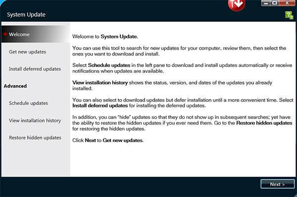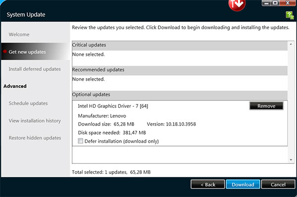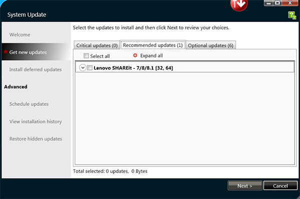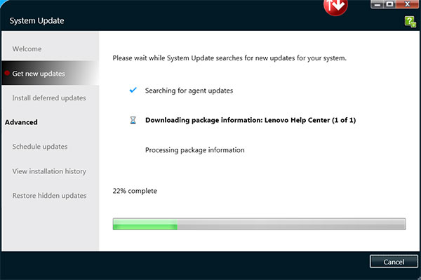 ThinkVanatage System Update to narzędzie do aktualizowania sterowników w notebookach Lenovo. Program sprawdza najnowsze drivery na stronie producenta i porównuje je z zainstalowanymi na komputerze. Jeśli nowa wersja zostanie wykryta, program powiadomi nas o tym i zasugeruje aktualizację. System Update zapewnia bezpośrednie połączenie z serwerem i wsparciem Lenovo ThinkPad, co pomaga zmaksymalizować wydajność systemu. Aby uruchomić aplikację należy wejść w Panel sterowania>Lenovo - Update and Drivers lub Start>Wszystkie Programy>Lenovo ThinkVantage Tools>System Update i wykonać poniższe kroki:
