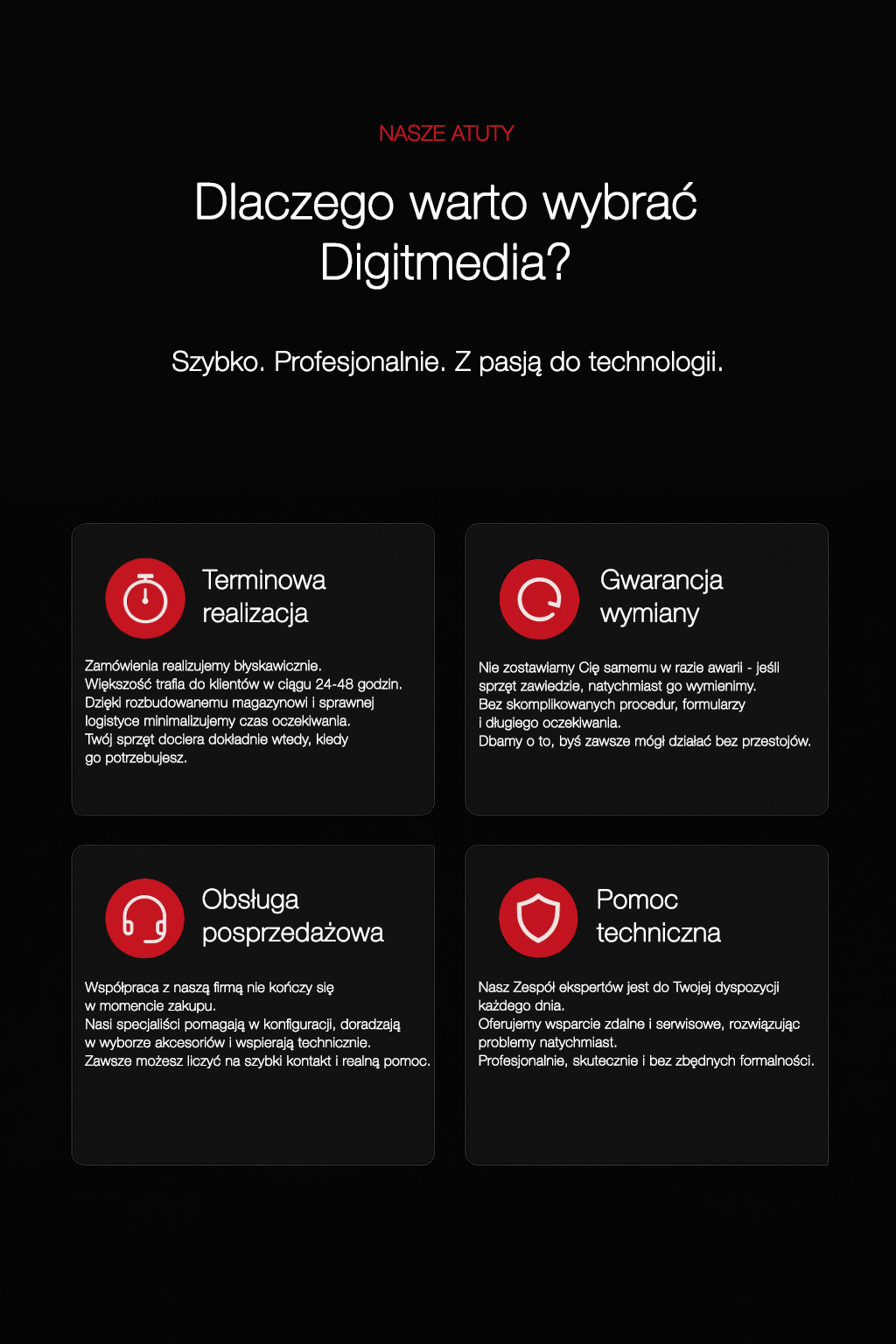 Dokonując zakupu w firmie Digitmedia otrzymują Państwo możliwość wymiany zakupionego produktu (z wykluczeniem oprogramowania oraz pakietów serwisowych) na wolny od wad w przypadku gdy ujawniona wada nie pozwala, bądź ogranicza na korzystanie zgodnie z przeznaczeniem w okresie nie przekraczającym 14 dni od zawarcia transakcji.