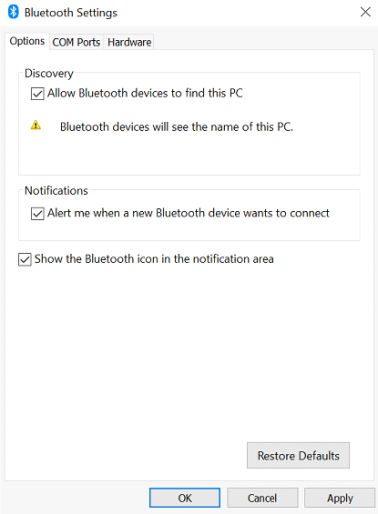 - Na karcie Opcje wybierz Zezwalaj urządzeniu Bluetooth na znalezienie tego komputera.