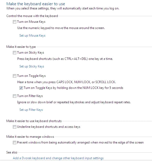 - Wybierz Panel sterowania, kliknij Ustawienia dostępu > Centrum ułatwień dostępu > Ułatw korzystanie z klawiatury.