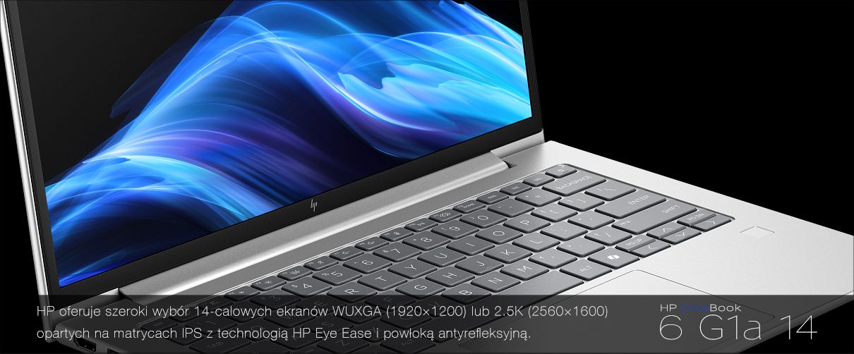 HP EliteBook 6 G1a oferuje szeroki wybór 14-calowych ekranów WUXGA (1920×1200) lub 2.5K (2560×1600), opartych na matrycach IPS z technologią HP Eye Ease i powłoką antyrefleksyjną.