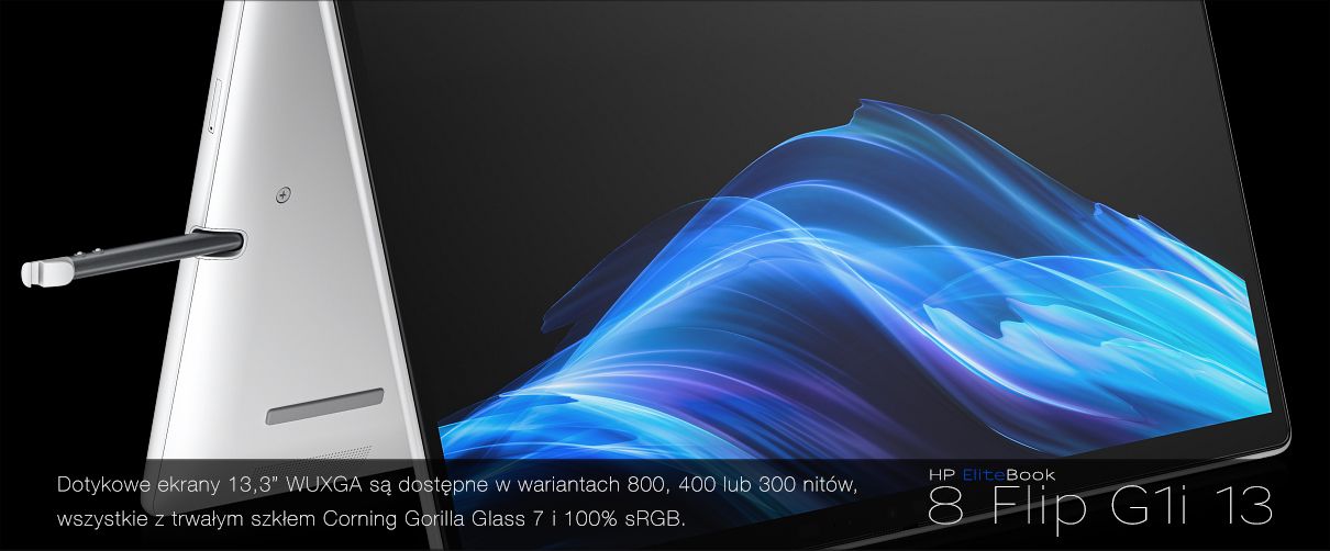 Dotykowe ekrany 13,3” WUXGA są dostępne w wariantach 800, 400 lub 300 nitów, wszystkie z trwałym szkłem Corning Gorilla Glass 7 i 100% sRGB w większości konfiguracji. Opcjonalna funkcja HP Sure View 5 chroni prywatność, ograniczając widoczność ekranu z boku.