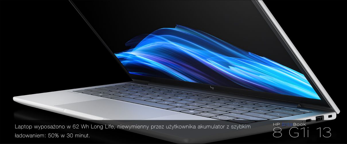 Konstrukcja urządzenia została zaprojektowana z myślą o wytrzymałości i codziennej pracy mobilnej. Obudowa w kolorze Glacier Silver spełnia wymagania normy MIL-STD-810H, a jednocześnie zachowuje niską wagę od 1,29 kg oraz smukły profil już od 1,2 cm. EliteBook 8 G1i 13 oferuje szeroką klawiaturę Premium, duży precyzyjny clickpad oraz konstrukcję umożliwiającą serwisową wymianę klawiatury i akumulatora.