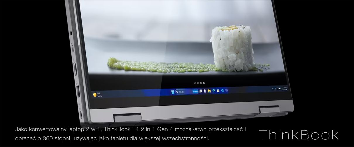 ThinkBook 14 2-in-1 2024 wyróżnia się konwertowalnością dzięki zawiasom obracanym o 360 stopni, które umożliwiają użytkowanie go zarówno jako laptopa, jak i tabletu. Ta wszechstronność sprawia, że jest idealny dla różnorodnych zastosowań, od pracy biurowej po prezentacje i projektowanie. Ponadto, 2-in-1 Gen 4 ma wymiary 313 x 224 x 16.9-18.5 mm i waży 1.64 kg, co czyni go łatwym do przenoszenia i wygodnym w użytkowaniu.