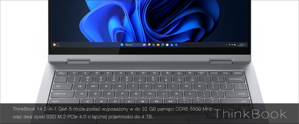 Laptop obsługuje szybkie pamięci RAM DDR5 (5600 MHz). Standardowe konfiguracje zaczynają się od 16 GB, z możliwością rozbudowy do 32 GB. ThinkBook 14 2-in-1 Gen 5 pozwala na instalację aż dwóch dysków SSD o łącznej pojemności nawet do 4 TB (2x2 TB), co gwarantuje szybki dostęp do danych i płynną pracę systemu.