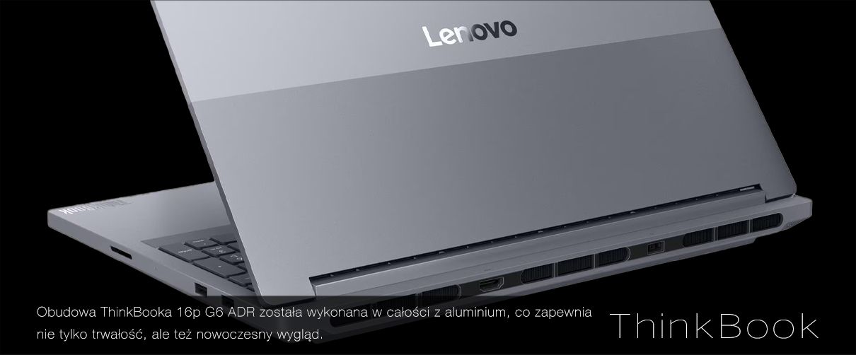 ThinkBook 16p G6 ADR wyróżnia się nowoczesną, precyzyjnie wykonaną obudową z aluminium (zarówno pokrywa jak i spód). Powierzchnia została wykończona techniką anodowanego piaskowania, co nadaje laptopowi elegancji i zwiększa odporność na zarysowania.