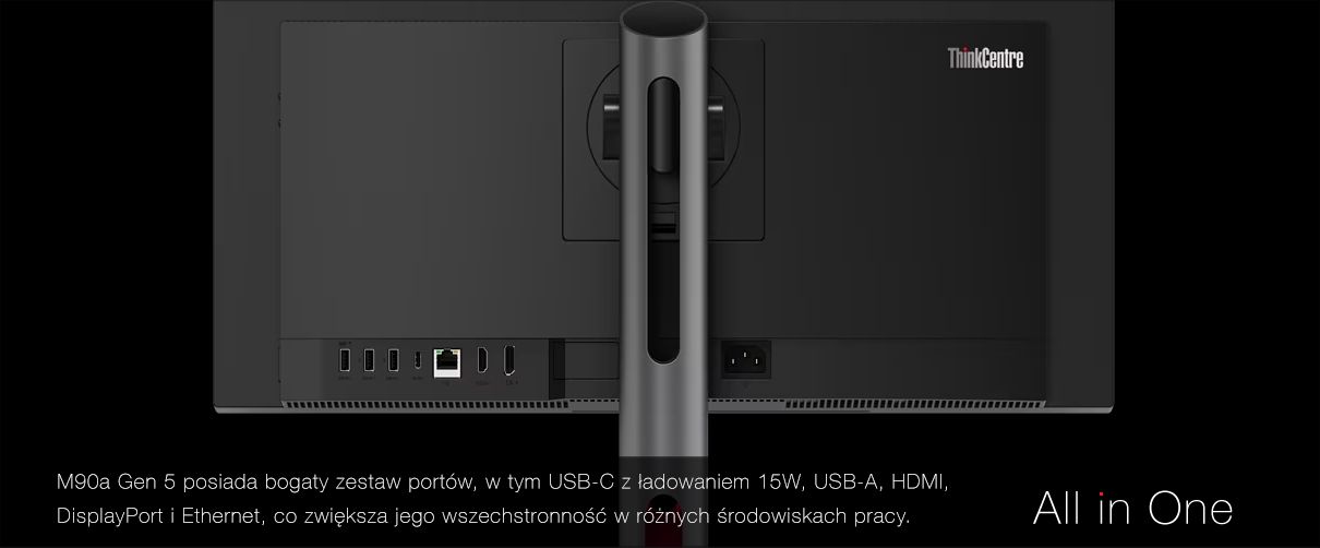 M90a Gen 5 wyposażony jest w 23,8-calowy ekran FHD IPS, dostępny zarówno w wersji dotykowej, jak i niet dotykowej. Co więcej, urządzenie posiada bogaty zestaw portów, w tym USB-C z ładowaniem 15W, USB-A, HDMI, DisplayPort i Ethernet, co zwiększa jego wszechstronność w różnych środowiskach pracy.