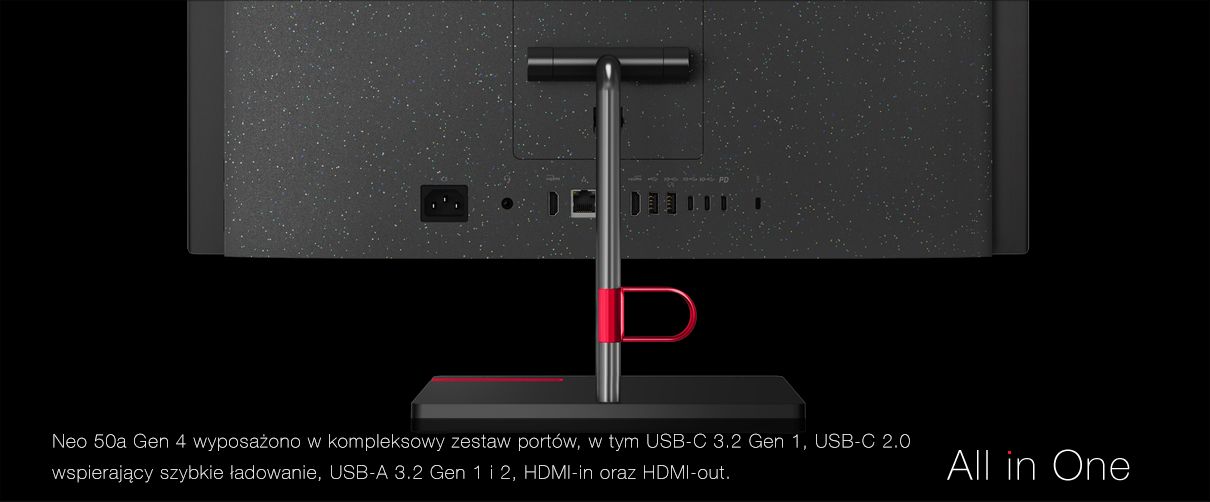 W zakresie łączności, Neo 50a Gen 4 wyposażono w kompleksowy zestaw portów, w tym USB-C 3.2 Gen 1, USB-C 2.0 wspierający szybkie ładowanie, USB-A 3.2 Gen 1 i 2, HDMI-in oraz HDMI-out, co zapewnia uniwersalną kompatybilność z różnorodnymi urządzeniami i akcesoriami.
