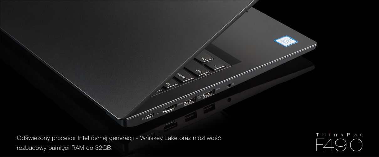 Najważniejsze zmiany dotyczą procesorów. W modelu ThinkPad E490 zastosowano procesor Intel Whiskey Lake-U. Procesor ten należy do serii 8. generacji i oferuje bardzo dużą wydajność przy jednoczesnym niskim poborze mocy. Dodatkowo procesory te gwarantują zdecydowanie szybsze działanie urządzenia w sieci bezprzewodowej. Kolejną zmianą jest odświeżenie wyglądu – w modelu E490 ramki ekranu są cieńsze i nieco zaokrąglone, więc urządzenie prezentuje się wyjątkowo elegancko. Seria biznesowych notebooków ThinkPad E490 obejmuje wiele różnych konfiguracji. Możliwość dobrania wyposażenia do swoich wymagań sprawia, że otrzymujesz ThinkPada, który staje się Twoim najlepszym towarzyszem pracy.