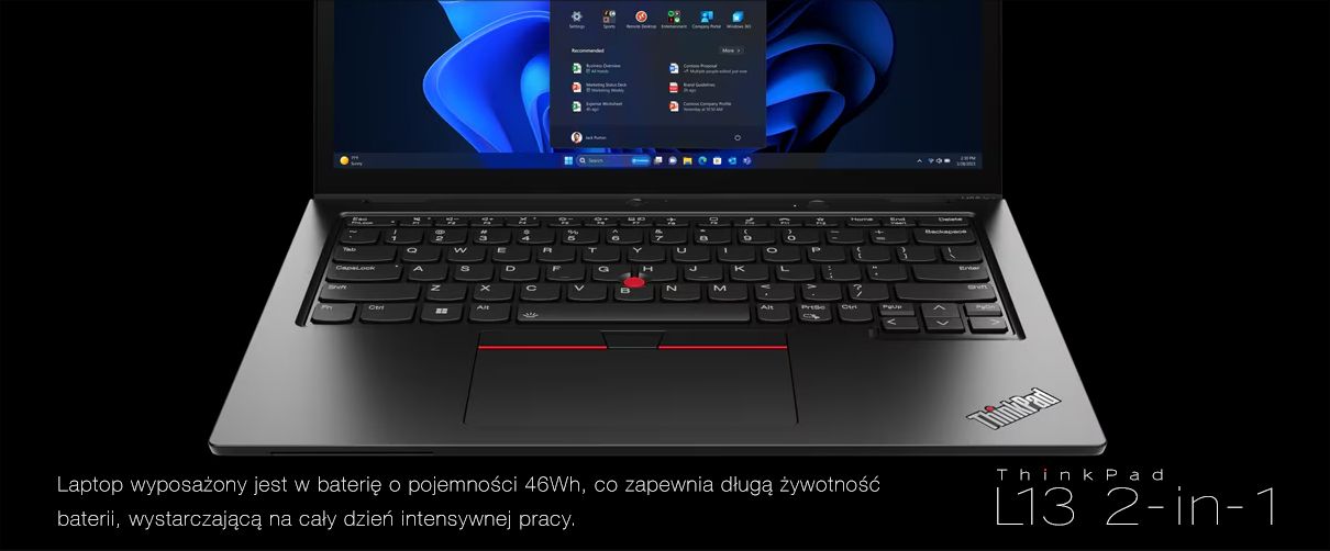 L13 2-in1 Gen 5 oferuje szeroki wachlarz opcji łączności, w tym porty USB-C, USB-A, HDMI 2.1 oraz gniazdo słuchawkowo-mikrofonowe. Obsługa Thunderbolt 4 umożliwia szybki transfer danych i wszechstronne możliwości podłączenia urządzeń zewnętrznych. Bezprzewodowe łącza Wi-Fi 6E oraz Bluetooth 5.2 zapewniają niezawodną łączność w każdych warunkach.
