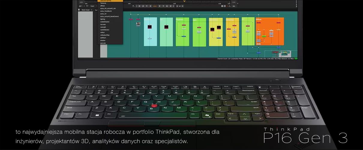 Lenovo ThinkPad P16 Gen 3 to najmocniejsza mobilna stacja robocza w ofercie Lenovo. Stworzona z myślą o inżynierach, projektantach CAD, twórcach treści wideo i użytkownikach wymagających certyfikacji ISV, łączy potężne procesory Intel® Core™ Ultra HX, najnowsze układy graficzne NVIDIA RTX Pro Blackwell, ogromną pamięć RAM i wyświetlacze wysokiej klasy w obudowie przetestowanej zgodnie ze standardem MIL-STD 810H.