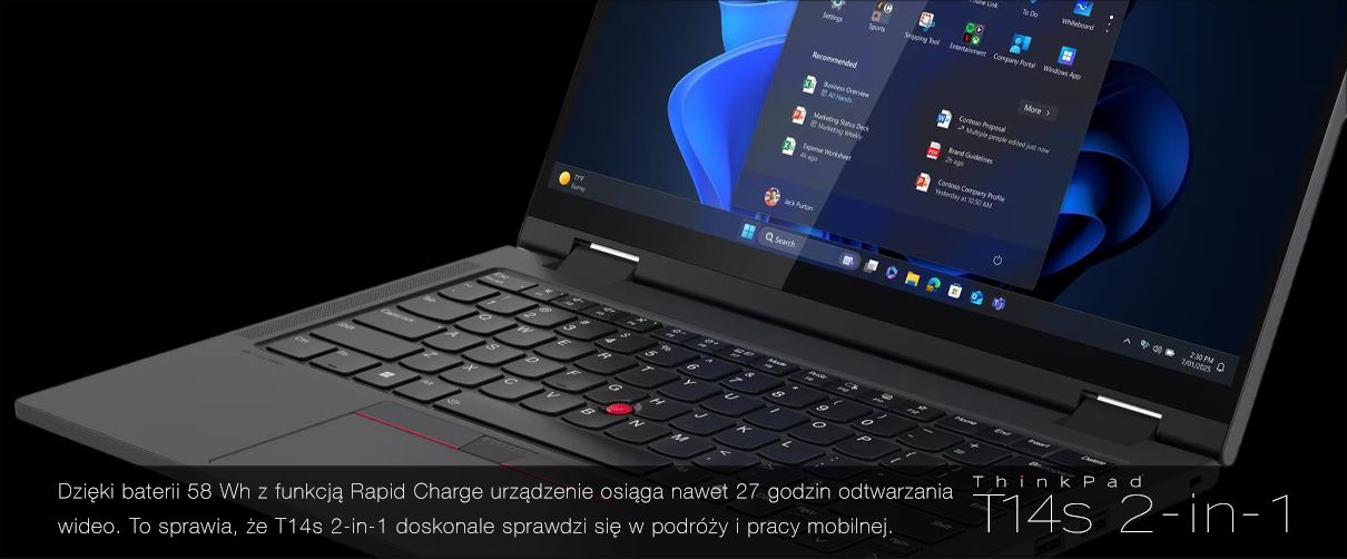Dzięki baterii 58 Wh z funkcją Rapid Charge urządzenie osiąga nawet 27 godzin odtwarzania wideo. To sprawia, że T14s 2-in-1 doskonale sprawdzi się w podróży i pracy mobilnej.
