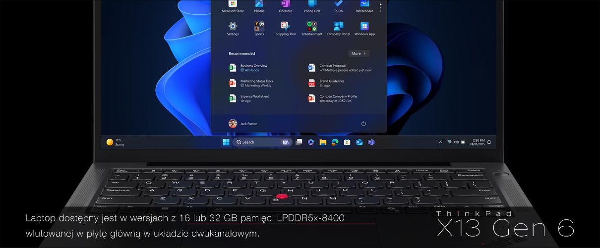 X13 Gen 6 oferuje 13,3-calowy ekran IPS o rozdzielczości WUXGA 1920x1200 i jasności 400 nitów. Obraz charakteryzuje się współczynnikiem kontrastu 1500 do 1 oraz stuprocentowym pokryciem palety barw sRGB. To idealne rozwiązanie zarówno dla użytkowników biurowych, jak i dla osób pracujących z grafiką.