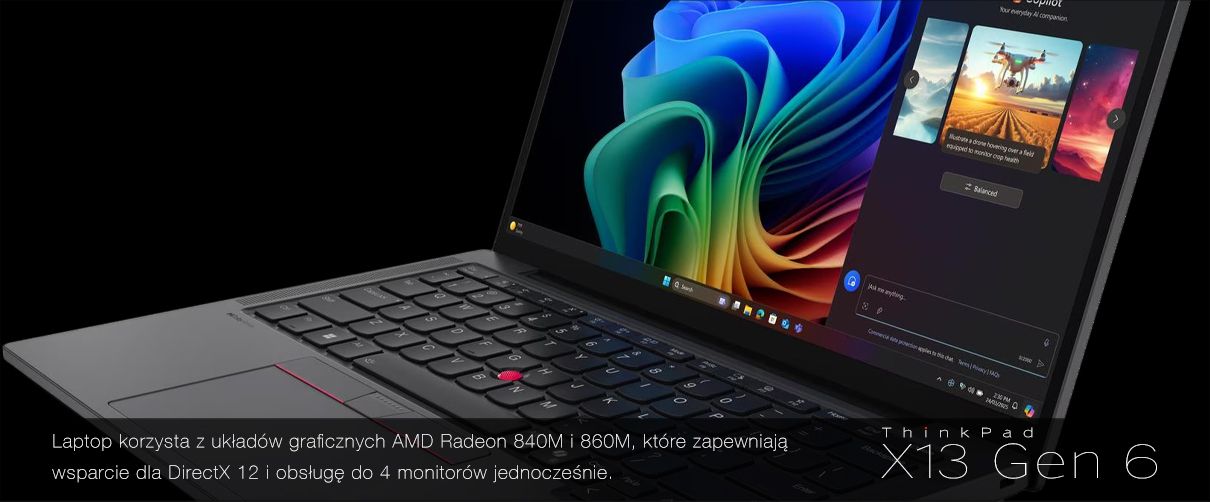 ThinkPad X13 Gen 6 (AMD) to kompaktowy notebook klasy premium wyposażony w najnowsze procesory AMD Ryzen AI PRO serii 300, w tym modele Ryzen AI 7 PRO 350 z 8 rdzeniami i 16 wątkami. Dzięki wbudowanemu NPU do 50 TOPS urządzenie spełnia wymagania platformy Copilot+ PC i obsługuje zaawansowane funkcje sztucznej inteligencji w systemie Windows 11.