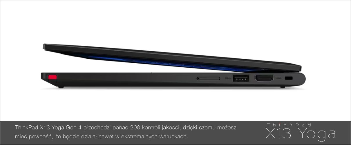 Notebook ma matrycę o przekątnej 13,3 cala na zawiasie umożliwiającym obracanie ekranu o 360 stopni oraz pojemną baterią, która magazynuje energię wystarczającą nawet na kilkanaście godzin pracy. ThinkPad X13 Yoga 4. generacji zachwyca jakością wykonania oraz standardem użytych materiałów konstrukcyjnych. Laptop został zaprojektowany z myślą o użytkownikach profesjonalnych. To urządzenie w kolorze czarnym jest eleganckie i klasyczne. ThinkPad X13 Yoga 4. generacji jest dotykowym notebookiem obsługiwanym specjalnym piórkiem. Urządzenie otrzymało certyfikaty popularnych producentów oprogramowania oraz wysokiej jakości głośniki i kamerę internetową z IR, a także przesłoną ThinkShutter. Laptop został zaprojektowany w taki sposób, by wspierać użytkownika bez względu na wykonywane zadania. Możliwości ThinkPada zostały dostosowane do aktualnych potrzeb użytkowników, szczególnie do wymagań związanych z pracą zdalną, m.in. do wideokonferencji wykorzystujących dźwięk i obraz.