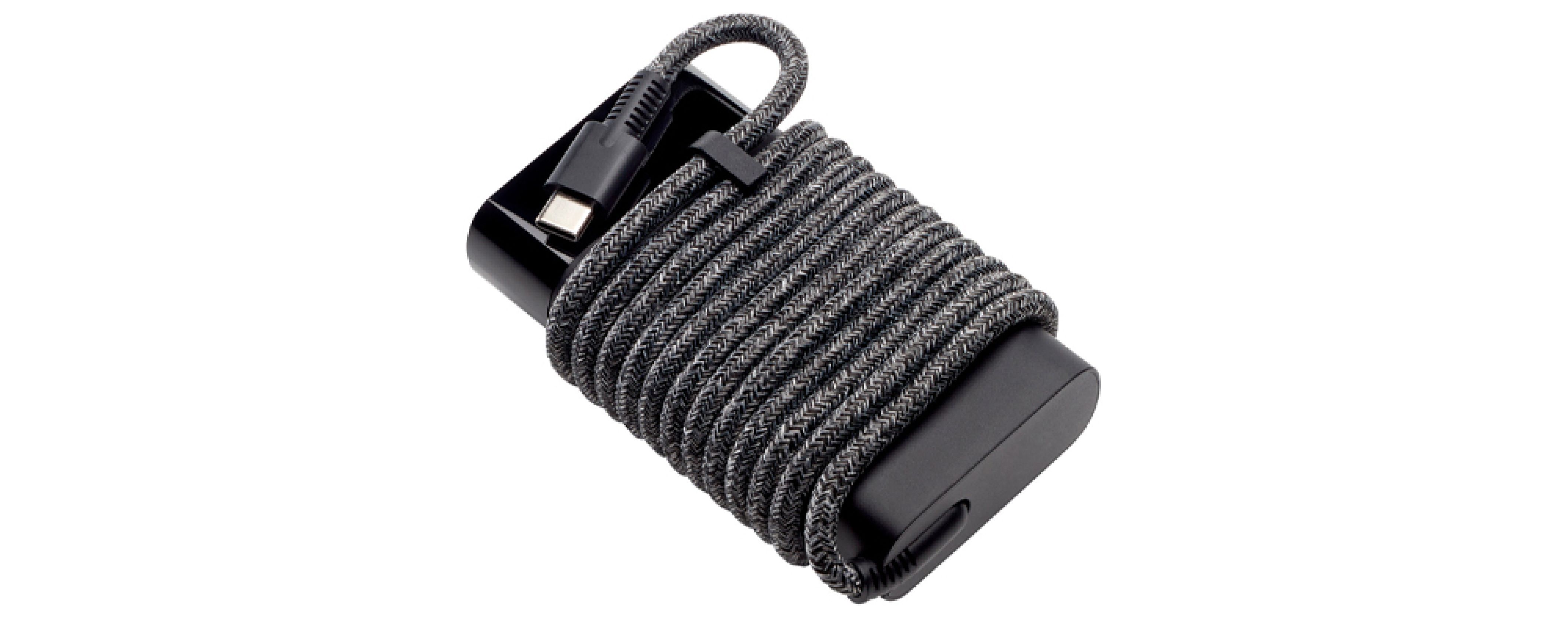 Czarny zasilacz o mocy 65 W i profilach 5–20 V, o wymiarach 97 × 53,5 × 21 mm i wadze 210 g, wyposażony w przewód 180 cm oraz kabel zasilający, zapewniający sprawność min. 89% oraz zabezpieczenia przeciwprzepięciowe, zgodny z laptopami i urządzeniami USB-C.