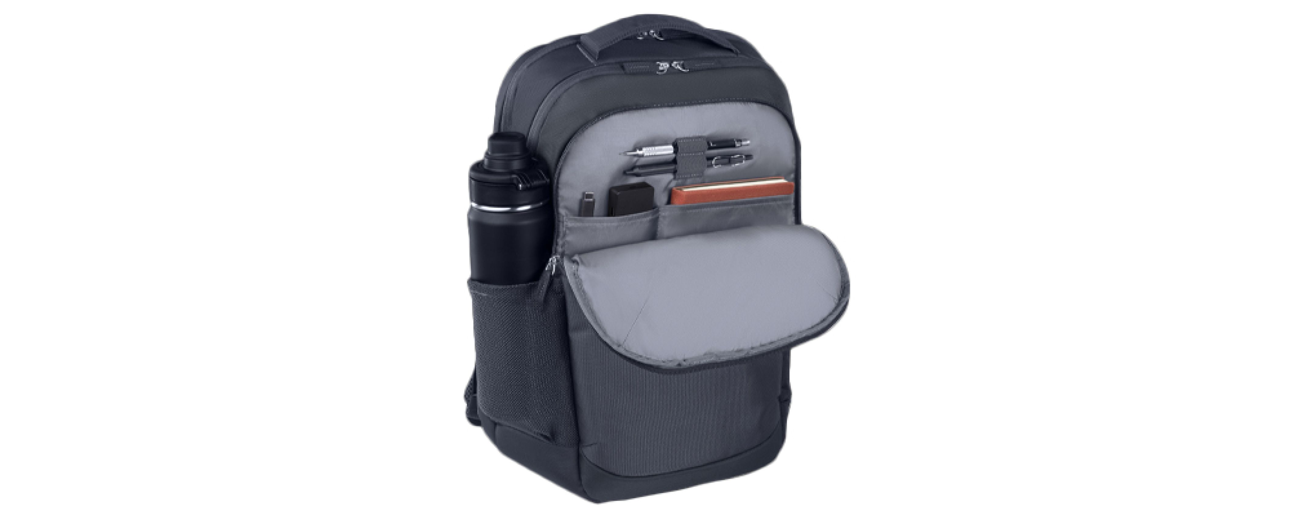 Plecak o pojemności 21 l wykonany w 60% z materiałów pochodzących z recyklingu, przeznaczony dla laptopów 16″ (max 40 × 27 × 3 cm), z wodoodpornego poliestru 600D, o wymiarach 31 × 15,5 × 44 cm, wadze 570 g, z wyściełanym panelem tylnym i mocowaniem do walizki.
