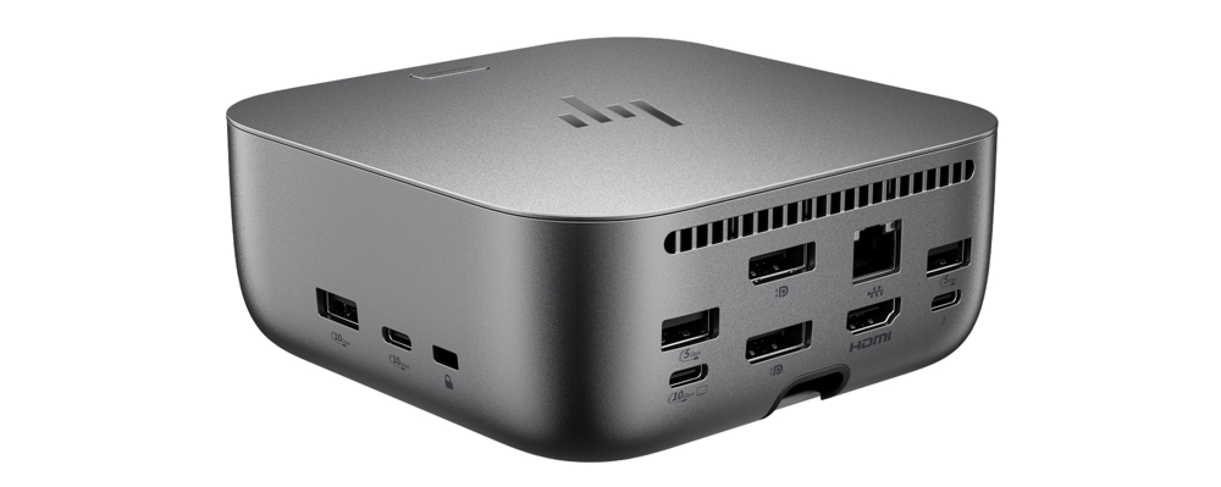 Przód: 1× USB-C 10 Gb/s (15 W); prawa strona: 1× USB-A 10 Gb/s (ładowanie), 1× USB-C 10 Gb/s (15 W), gniazdo blokady Nano; lewa strona: 2× USB-A 10 Gb/s (ładowanie); tył: 1× Thunderbolt 4 (40 Gb/s), 1× USB-C 10 Gb/s (zasilanie/DP 1.4), 2× USB-A 5 Gb/s (ładowanie), 1× HDMI 2.1, 2× DisplayPort 1.4 oraz 1× RJ-45 2.5 GbE.