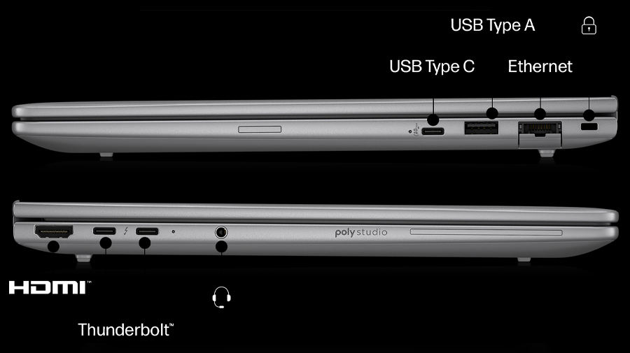 System audio Poly Studio zapewnia czysty dźwięk dzięki podwójnym mikrofonom i zoptymalizowanym głośnikom, co sprawia, że laptop idealnie sprawdza się w pracy hybrydowej i zdalnej.