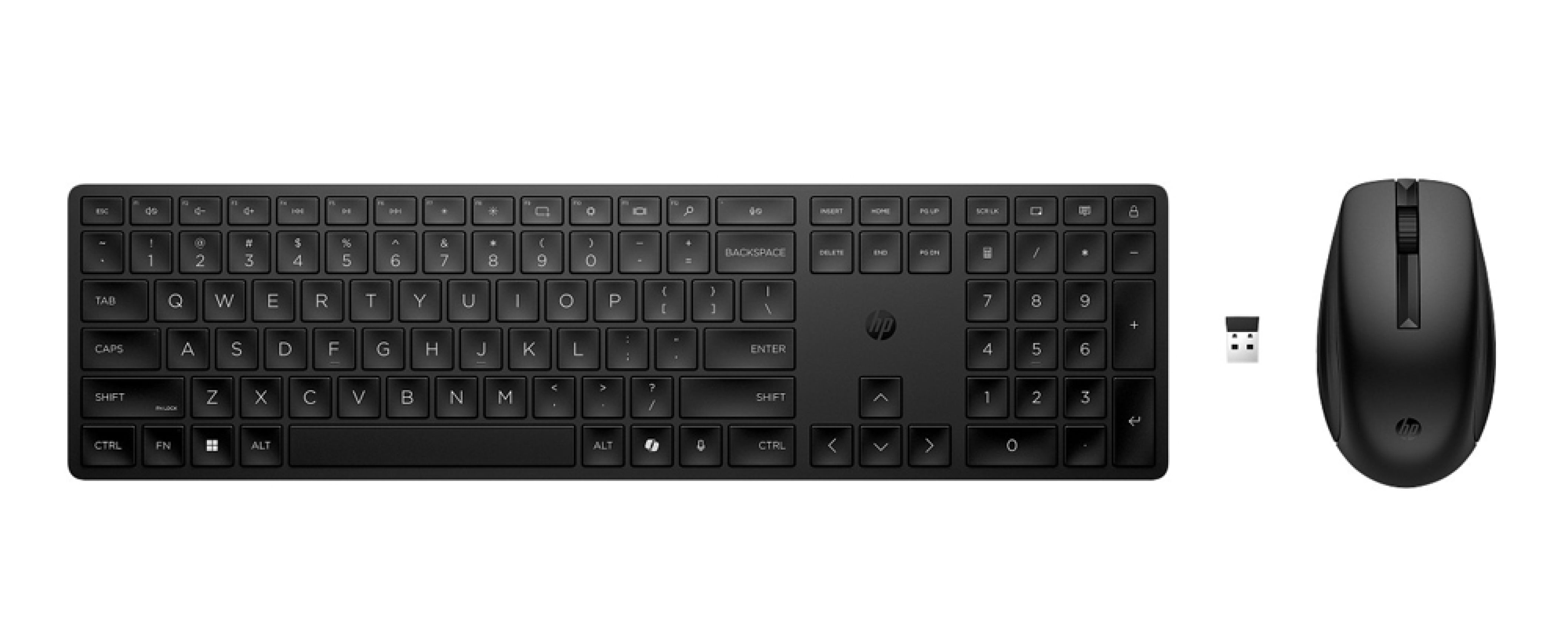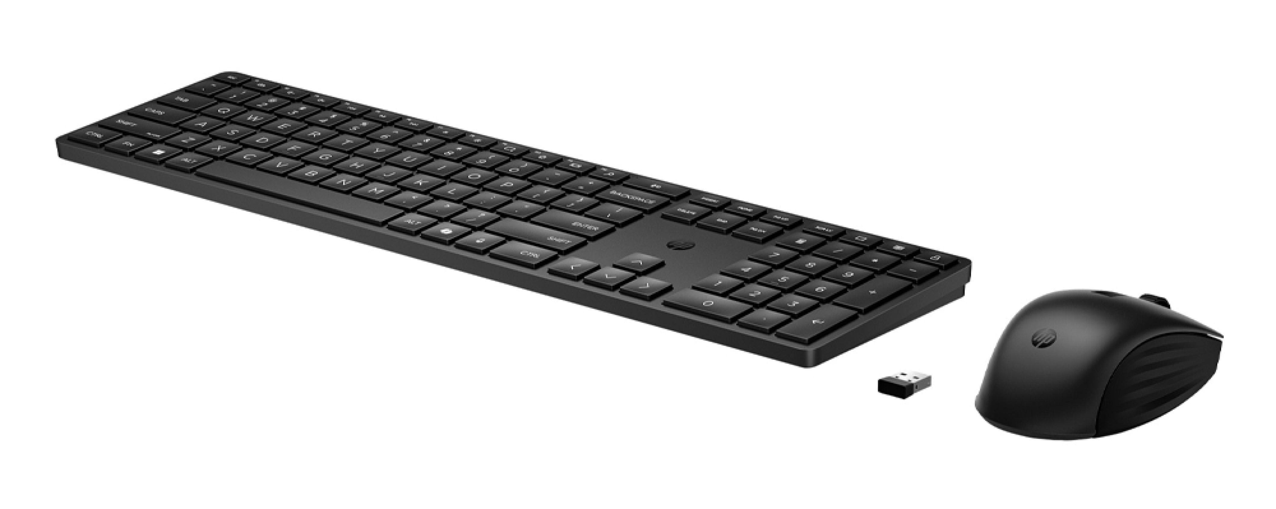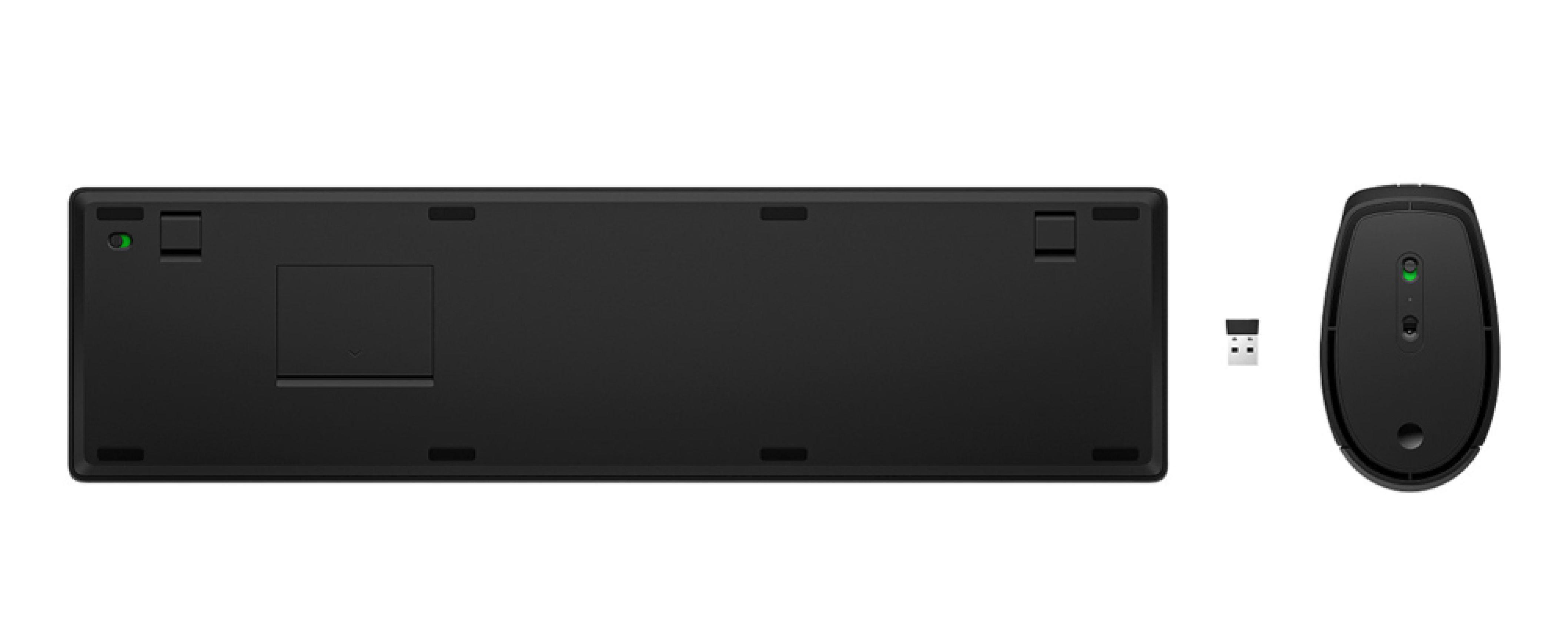 Czarny zestaw klawiatury i myszy wykonany w 60% z plastiku pokonsumenckiego, z klawiaturą 428,22 × 115,47 × 18,06 mm i 430 g oraz myszą 120,28 × 69,95 × 41,39 mm i 88 g, obsługujący do 24 miesięcy pracy myszy i do 20 miesięcy klawiatury na bateriach, pełnowymiarowym układem 3-strefowym, rozdzielczością myszy do 4000 DPI i zasięgiem bezprzewodowym do 10 m.