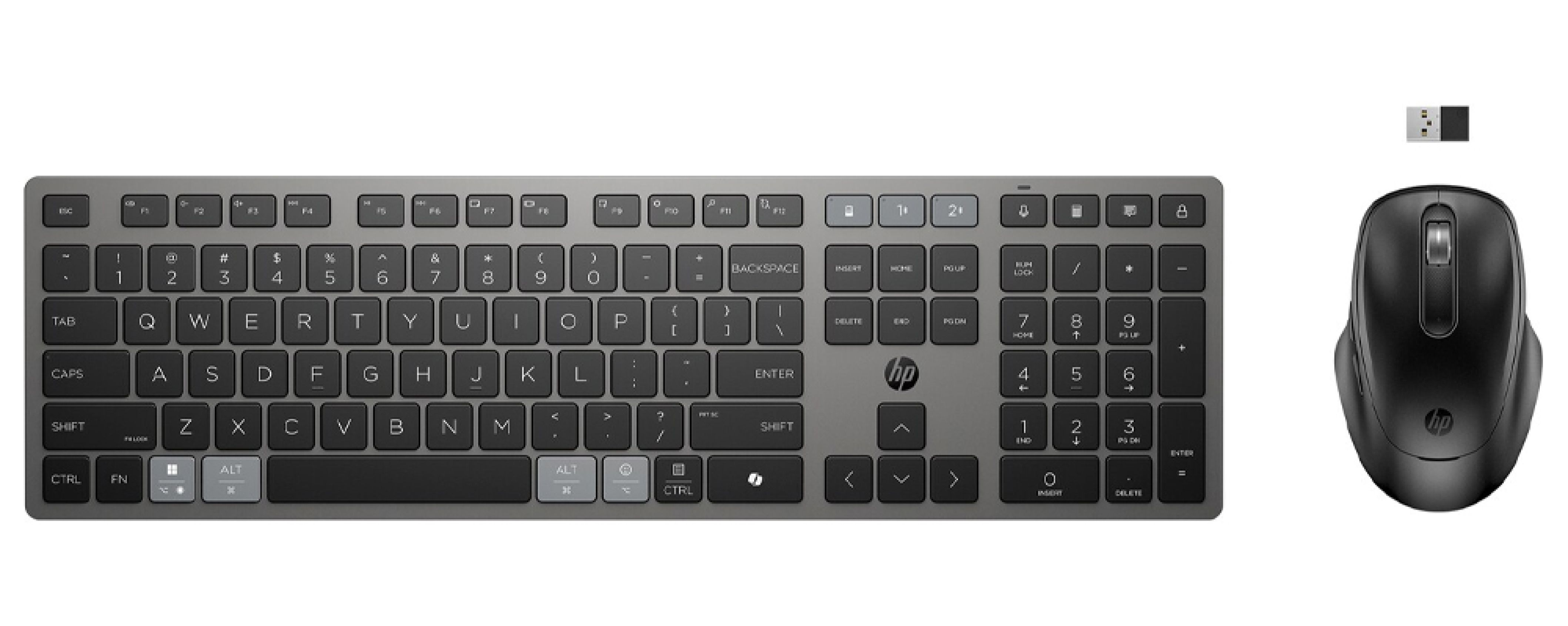 Obsługa trzech urządzeń jednocześnie (2× Bluetooth + nano-odbiornik 2,4 GHz), ultraszybkie ładowanie superkondensatora, ponad 22 programowalne klawisze, klawisz Copilot, ergonomiczne ciche klawisze, precyzyjny sensor myszy działający na wielu powierzchniach, przewijanie 2D, HP Accessory Center oraz odbiornik unifying dla maksymalnie 8 akcesoriów.