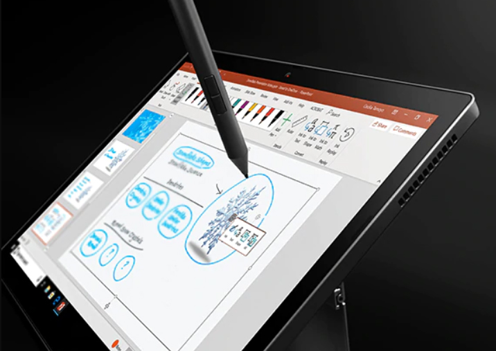ThinkPad X12 Detachable należy do segmentu niemalże pancernych urządzeń przenośnych przeznaczonych do pracy nie tylko w wygodnych i bezpiecznych warunkach biurowych, ale także w tych miejscach, w których zapylenie, wilgoć czy wstrząsy są na porządku dziennym. Wzmocniona konstrukcja modelu X12 Detachable przetrwa nawet bardzo trudne okoliczności i co ważne, w każdej sytuacji zapewni możliwość efektywnej pracy, a trzeba wspomnieć, że waga urządzenia razem z klawiaturą to zaledwie 1,1 kg. W tej niewielkiej konstrukcji wykorzystano dotykowy ekran FULL HD o przekątnej 12 cali o współczynniku proporcji 3:2, co daje dużo dodatkowej przestrzeni i ułatwia pracę wielozadaniowym użytkownikom.